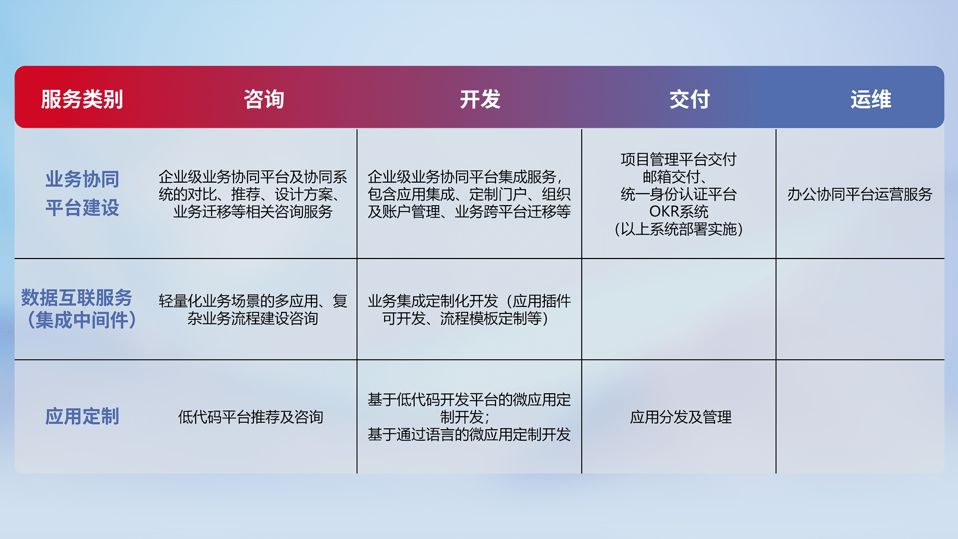 针对钉钉、、、企微、、、IDaas等平台级产品提供产品的规划、、方案、、、、交付、、、定制化开发等服务,,,,实现如统一协同办公、、、、智能客户服务、、、、混合会议管理、、、、智能数据查询、、、、等业务场景,,,,实现数字化转型。。。。