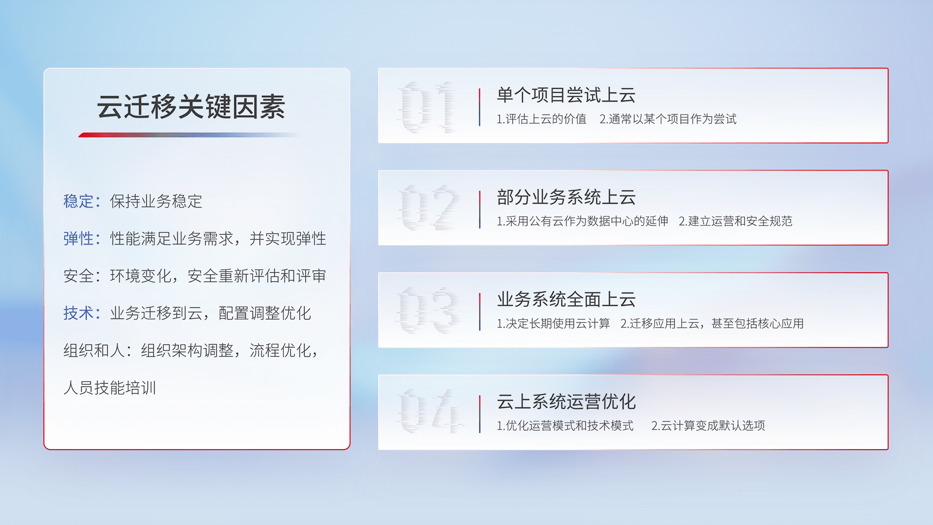 结合实际业务,,,从规划设计、、、云平台选型、、、云原生改造、、数据迁移、、、集成交付,,迁移全过程为客户识别最佳上云路径,,做好风险识别管理,,,设计网络架构、、身份权限、、、、安全审计合规、、、、操作审计、、、、日志审计、、、、监控告警策略、、、多站点容灾设计等,,,,对云上基础设施进行整体规划,,,,提升IT治理水平,,,以满足弹性、、、高可用、、、高性能的需求。。。